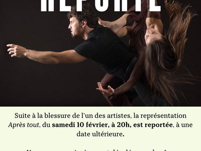 Suite à une blessure de l’un des artistes, nous sommes contraints de reporter le spectacle Après tout du samedi 10 février. Nous vous communiquerons prochainement la date du report. Ce n’est que partie remise !